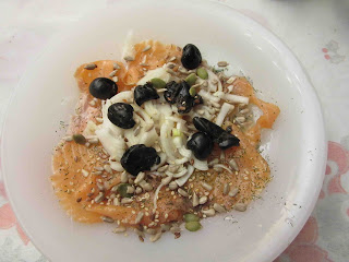 Poner el salmón extendido en un plato llano. Picar la cebolleta menuda y las aceitunas en aros o machadas para restar jugo. Dar un toque de vinagre y colocar el crujiente de semillas. Regar con un hilo de aceite.